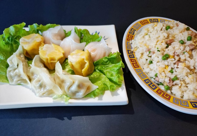 3 ravioli vapeur au poulet, 3 ravioli vapeur au crevette, 3 vapeur Siumai au crevette, riz cantonais